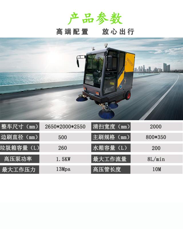 產(chǎn)品簡(jiǎn)介:產(chǎn)品型號:電動(dòng)四輪洗掃車(chē)XD2000,電池容量:48V/150A整車(chē)尺寸:2650*2000*2550mm垃圾箱容量:260L水箱容量:200L作業(yè)功率:1000W(主刷) + 500W(風(fēng)機) X 2 + 100W(振塵) X2 + 90W(邊刷)X 4+50W(水泵)高壓泵…