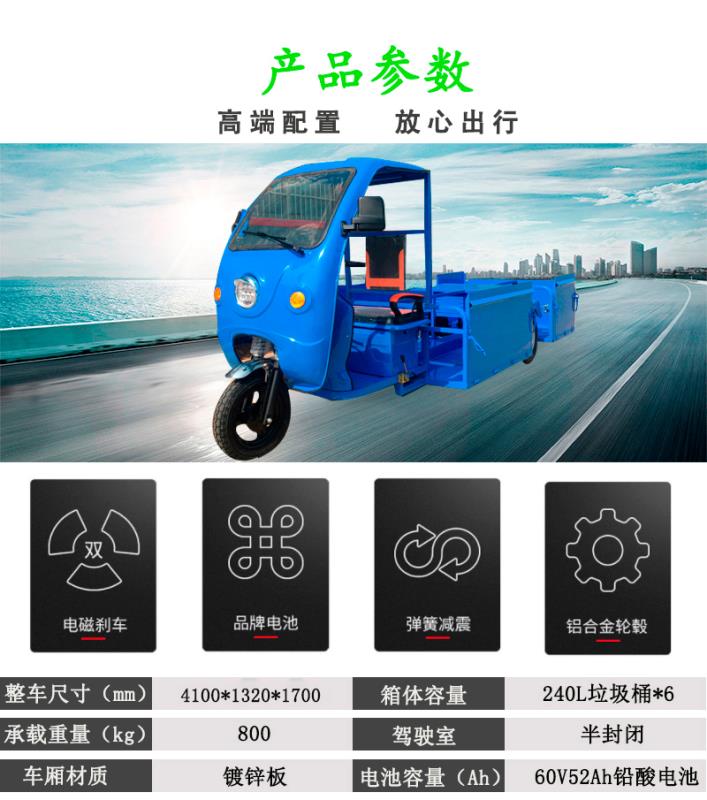 產(chǎn)品簡(jiǎn)介:ZT6-3;可拉六桶垃圾,每個(gè)桶容積 240L。整車(chē)尺寸4100*1320*1700mm,承載重量800kg,車(chē)廂材質(zhì)2.0mm 鍍鋅板,主梁 2.5mm 加厚碳鋼,液壓加粗減震前叉,車(chē)架電池盒,鉛酸電池,60v52超威免維護電池,電壓60V,側門(mén)及后門(mén)可…