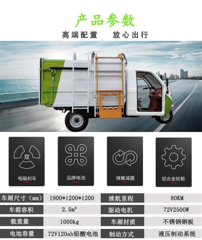 產(chǎn)品簡(jiǎn)介:車(chē)廂尺寸:1900*1200*1200mm;載重量:1000kg;車(chē)箱容積:2.5m;續航里程:80km;電池容量:72V120ah鉛酸電池;驅動(dòng)電機:(免維護無(wú)刷電機)72V2500W