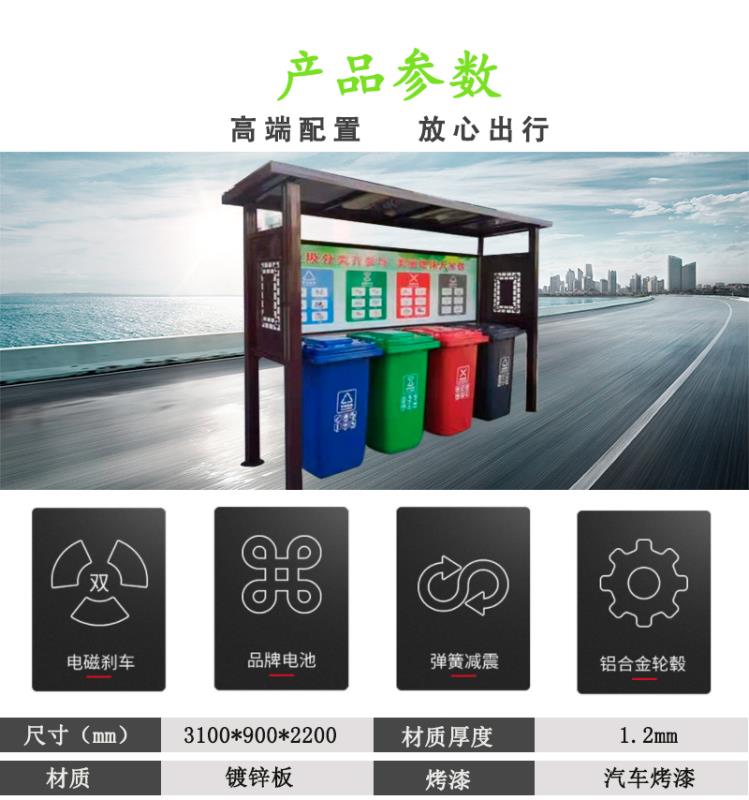 產(chǎn)品簡(jiǎn)介:1、尺寸(長(cháng)*寬*高):3100mm*900mm*2200mm2、鍍鋅板、鋅合金成型管,花紋鋼板,厚度1.2mm3、表面汽車(chē)烤漆、靜電噴塑、高溫固化。4、亭內可配備4分類(lèi)塑料垃圾桶,設置垃圾分類(lèi)標識欄,分類(lèi)清晰,具體內容由采購方確定。