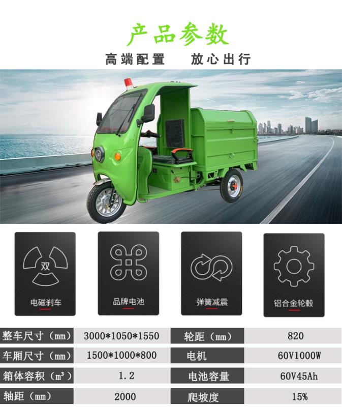 產(chǎn)品簡(jiǎn)介:型號:QY3-1;額定成員:1人;整車(chē)尺寸:3000*1050*1550(mm);車(chē)廂尺寸:1500*1000*800(mm);后輪距:820 mm;軸距:2000 mm,箱體容積:1.2立方;電池:60V45Ah超威牌免維護高效鉛酸電池